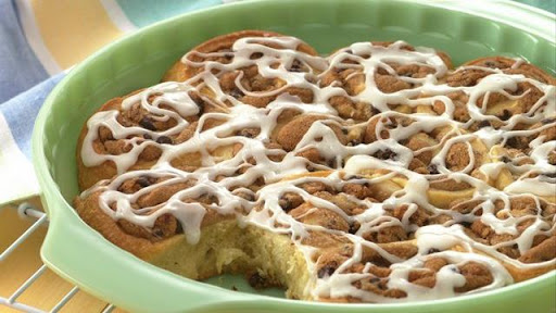 Meanwhile, in small bowl, mix glaze ingredients, adding enough milk for desired drizzling consistency. Drizzle over warm rolls. Serve warm.