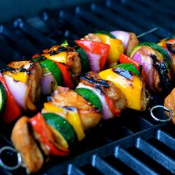 Drain marinade from the chicken and vegetables, and discard marinade. Thread chicken and vegetables alternately onto the skewers.