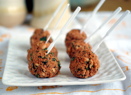 The simplicity of these balls belies their complex flavors. The pairing of fresh basil and tomato paste here is truly evocative of pizza. These make a great party appetizer or main course alongside a crisp salad.