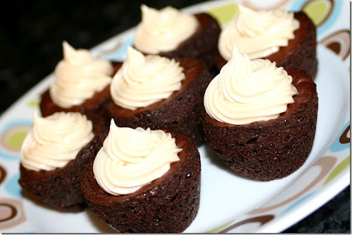 To make the frosting, whip the butter and cream cheese together until smooth. Add the caramel sauce and blend. Add the confectioners sugar and whip until creamy and smooth. Using a pastry or plastic bag with a piping tip, pipe the frosting onto the top of each brownie bite. Chill in the refrigerator to set the frosting a bit before serving.