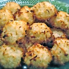 Preheat oven to 350. One at a time, scoop dough into 1.5" balls (about the size of a large walnut, roll between your palms, then roll in the bowl of remaining coconut (4 cups). Arrange on an ungreased baking sheet, at least an inch apart (cookies will spread slightly). A standard cookie sheet should accommodate a dozen cookies at a time. Bake 12-14 minutes, until the cookies puff and are very lightly browned.