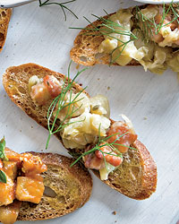 - 30 baguette slices, brushed with olive oil and toasted