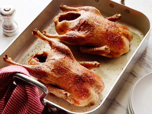 Remove from the oven, tent with foil and let rest for 20 minutes. Gently reheat the sauce over low heat. Carve the duck, put the pieces on a serving platter and serve with sauce.