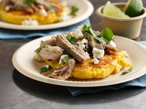 To serve, place 1 arepa on plate; top with about 1/4 cup pulled pork, 3 tablespoons reserved corn and 1 tablespoon queso fresco. Sprinkle with cilantro, and serve with lime wedge