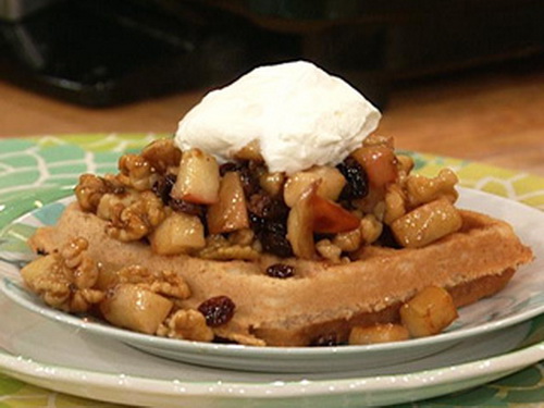 For dessert-style waffles: Sauté two crisp, thinly sliced apples in a tablespoon of butter. Add a handful of walnuts, some raisins and 1 tablespoon brown sugar. Cook until sugar melts and apples soften slightly. Pour mixture over waffles.