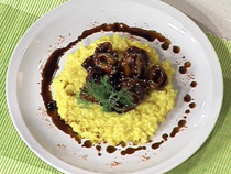 - En un plato, espolvoreado con pimentón sirva el risotto, agregue en el centro los calamares, rocíe con el fondo de cocción, decore con hierbas aromáticas y termine con pimienta