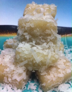 Let it cool completely in the refrigerator. Cut into bite sizes and roll over the grated coconut. Serve cold