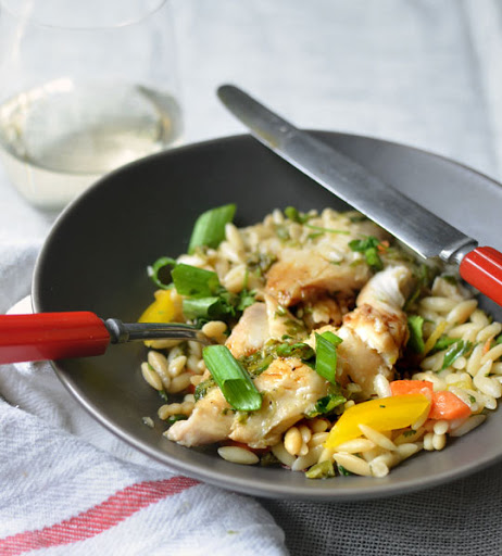 Serve immediately over brown rice or orzo, garnished with the additional scallions and cilantro.