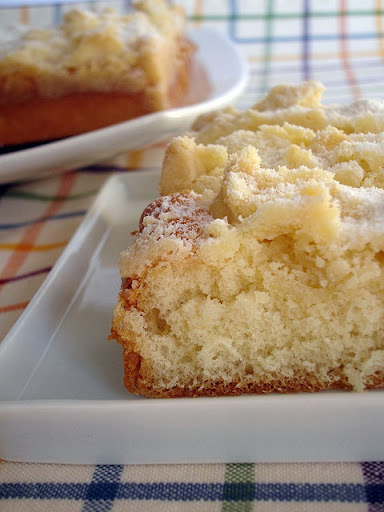 Remove the pan from the oven and immediately sprinkle the top with a generous layer of vanilla confectioners’ sugar. Cool completely on a wire rack. This is at his best when very fresh. Cut into portions with a sharp knife.