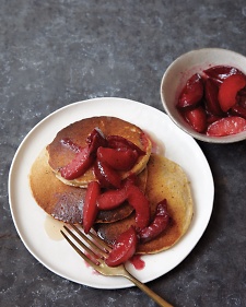 Warm butter in a cast-iron pan over medium heat. For each pancake, ladle in 1/4 cup batter and cook until bubbles appear in center and edges are set, 2 to 3 minutes. Flip and cook until golden brown, 2 minutes more. Serve with Sauteed Plums in Maple Syrup.