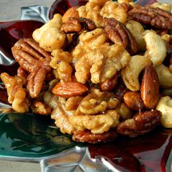 Bake nuts in the preheated oven for 10 minutes. Stir nuts until the warm syrup coats every nut. Spread into a single layer, return to the oven, and bake until nuts are sticky and roasted, about 6 minutes. Allow to cool before serving.
