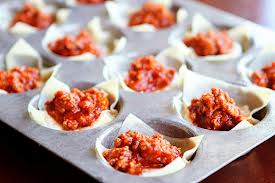 4. Press a wonton wrapper into each cupcake section, add a spoonful of the cheese mixture, a spoon of the turkey mixture, sprinkle with mozzarella cheese, layer another wonton wrapper, allowing it to drop over the edges of the pan, repeat the layers and top with 1 tbsp.of the moz. cheese.