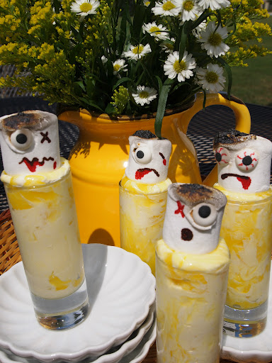 4. Decorate marshmallows with zombie face and place on parfaits.