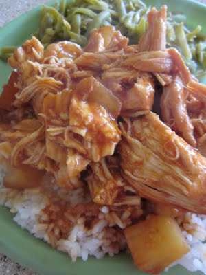 Spray the inside of your crock pot with cooking spray for an easy cleanup! Place frozen chicken breasts in the crock pot and cover with sauce. Empty can of drained pineapple chunks on top. Cook on High for 2-3 hours or Low for 4-6 hours. Shred chicken with two forks while still in the crock pot so the chicken will be well coated with sauce. Serve over rice.