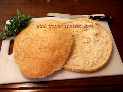Combine the water, yeast and sugar in the workbowl of a stand mixer, stir well and let stand for 5-10 minutes or until good and foamy. Meanwhile, combine the flours, salt, and lard in a bowl and work in the fat with your hands until broken up into very small pieces. When the yeast is foamy, fit the mixer with a dough hook attachment and gradually add the flour on low speed until its all incorporated. Scrape the sides down between additions. When the dough comes together, turn it onto a floured work surface and knead until smooth and elastic, 5-10 minutes, adding more flour if necessary.. Alternatively, you can let the machine do the work, but for me, bread is a touch thing. Coat a large bowl with the Olive Oil, then put the dough in, turning once to coat both sides. Cover loosely with a clean dry towel, or plastic wrap. Let the dough rise in a warm place until doubled in bulk, about 1-1/2 hours. Punch the dough down and shape into a flat round about 9 inches across (it will expand to about 10″.) Place the dough on a lightly oiled baking sheet. Sprinkle the top with sesame seeds, about 2-3 Tbsp should do it, then press them lightly into the dough. Loosely cover the loaf and let rise until doubled in bulk, about 1 hour. When the dough has risen, remove the cover, gently brush with the egg wash then gently place into a preheated 425 degree F oven for 10 minutes. Turn the heat down to 375 degrees F for an additional 25 minutes or until it’s golden brown and sounds hollow when tapped.