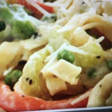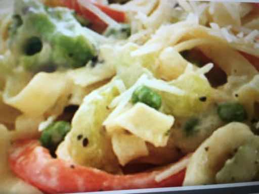 2. COMBINE CORNSTARCH AND SMALL AMOUNT OF BROTH IN SMALL BOWL; gRADUALLY STIR IN REMINING BROTH, BELL PEPPER AND PEAS. cOOK OVER MEDIUM HEAT, STIRRING CONSTANTLY UNTIL SAUCE IS THICKENED AND VEGETABLE ARE TENDER (DO NOT BOIL) SERVE OVER PASTA SPRINKLE WITH CHEESE.