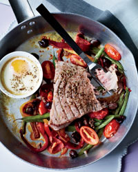 Lightly squeeze the tomatoes and add to the pan. Add the olives, bell pepper, anchovies and basil, toss with 1/4 cup of the olive oil and season with salt and pepper. Brush the tuna steaks with 1 tablespoon of the olive oil and season with salt and pepper. Set the tuna on the vegetables. Nestle 4 ramekins among the vegetables and crack an egg into each ramekin. Drizzle the eggs with 1 tablespoon of the oil and season with salt and pepper