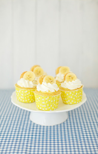 To fill the cupcakes, use the cone method to hollow out the center of the cupcakes (I prefer the paring knife method for these cupcakes). Discard the cones. Place a single slice of banana inside of each cupcake. Top with a small spoonful of the pastry cream and another slice of banana on top of that.