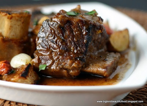 Raise the oven temperature to 425 degrees. Put the short ribs, onions, reserved roasted vegetables, and strained liquid into the roasting pan and bring to a boil on top of the stove. Return the pan to the oven and roast for 35-40 minutes, or until a knife inserted into the center of the ribs comes out hot. (Ninette's modification: Since I didn't let the liquid cool down, I didn't do the second round in the oven. I just added the veggies and onions to the meat and liquid in the dutch oven, gently mixed them in, and heated the mixture on the stove top over medium-low heat until the liquid is simmering and the veggies are warmed through.)