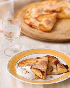 Heat oven to 400 degrees with rack in center. Line a baking sheet with parchment. Combine cream cheese and butter in a food processor. Add flour, 1/4 cup sugar, and salt, and process until combined. Dough will be sticky. Turn dough out onto prepared baking sheet. With lightly floured fingers, pat dough out into a flat 8-inch circle.