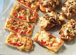 On floured work surface, roll out the puff pastry into 8 x 10 rectangle and cut into 2 x 4" rectangles. Place on a baking sheet. Brush dough with the mustard. Scatter basil leaves over dough, then tomatoes. Season. Sprinkle with cheese.