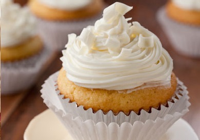 Spoon frosting into decorating bag fitted with star tip. Pipe frosting in circular pattern on tops of cupcakes. Garnish with white chocolate shavings.