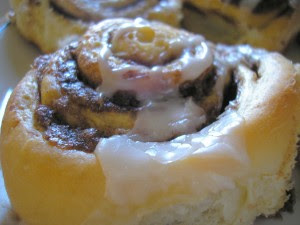 Turn 1/2 out on well floured surface (coat with flour to handle). Roll out into rectangle. Spread with the layer ingredients: first butter then sugar and finally cinnamon add raisins/nuts at this point if desired. Roll up and cut slices with clean dental floss (put floss underneath then criss-cross upwards to make a clean slice without squishing). Put in baking dish/pan.