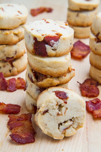 Beat the butter and maple syrup until smooth, mix in the flour, cornstarch and salt and then the bacon.