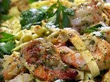 While the pasta cooks, prepare the sauce. Set a 12-inch saute pan over medium-high heat. Add the butter and olive oil to the pan. Once the butter has melted, season the shrimp with 1 tablespoon of the Essence and 1/2 teaspoon of the salt and add the shrimp to the pan. Sear the shrimp until pink, about 1 minute, then turn over and cook for another minute. Remove the shrimp from the pan and set aside. Add the onions and saute until softened and lightly caramelized, about 4 to 5 minutes. Add the garlic to the pan and saute until fragrant, about 30 seconds. Add the cream, pesto, remaining tablespoon of Essence, remaining teaspoon of the salt to the pan and bring to a boil. Cook the sauce until the cream is reduced by half, about 2 minutes. Return the shrimp, linguine and the reserved cooking water to the pan and cook, tossing to incorporate for 3 to 5 minutes. Remove pan from the heat and add the parsley and parmesan cheese and toss to blend. Serve immediately