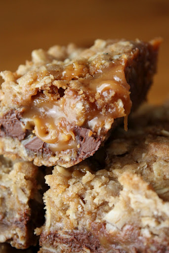 Combine caramels and cream in a small saucepan over low heat. Stir until completely smooth; set aside. In a separate bowl, combine melted butter, brown sugar, flour, oats, and baking soda. Pat half of the oatmeal mixture into the bottom of an 8x8" pan. Bake at 350 degrees for 10 minutes. Remove pan from oven and sprinkle chocolate chips over crust. Pour caramel mixture over chocolate chips. Crumble remaining oatmeal mixture over caramel. Return to oven and bake an additional 15-20 minutes, until the edges are lightly browned. Remove from oven and cool completely before cutting.
