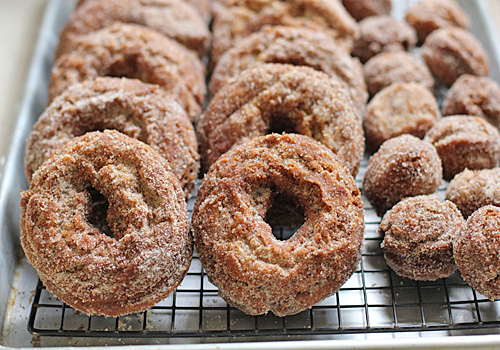 Line a baking sheet with paper towels and set a wire rack on top. In a dutch oven or cast iron pot, add enough oil or shortening to measure a depth of 3-inches. Heat the oil until a candy thermometer reaches 350º F. Carefully drop a couple of doughnuts at a time into the hot oil. Fry until golden brown on the first side, about 1 minute. Carefully turn the doughnuts over and fry on the other side until golden and cooked through, about 30-60 seconds. Transfer to the prepared wire rack and allow to drain and cool slightly. Once cool enough to handle, dredge in the cinnamon mixture, sprinkling on all sides. Return on the rack to cool a bit more. Serve warm or at room temperature. Leftovers can be stored in an airtight container at room temperature for two days or frozen for up to one month. At room temperature doughnuts can be re-warmed in the microwave briefly. Frozen doughnuts can be thawed in the refrigerator before warming in the microwave. Enjoy!