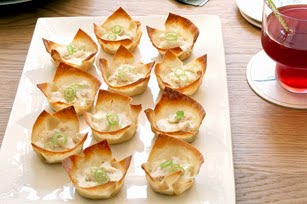 Bake won ton wrappers in muffin cups at 350°F 5-7 minutes or until lightly browned. Fill with crab meat mixture and bake 6-8 minutes or until filling is heated through.