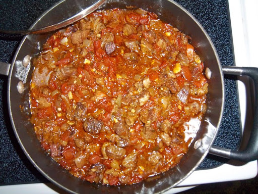 2. Heat heavy pan to medium heat, add ribeye and cook it until it almost looks like cracklins, chicharrones. Add the onions and serrano peppers and cook for 3 minutes; add garlic and cook for another minute.
