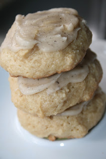 Blend together butter and brown sugar. Add eggs, one at a time; blend well. Add vanilla; beat until light. In a separate bowl, stir together flour, baking powder, baking soda and salt. Add flour mixture to butter mixture alternately with sour cream; mix well. Drop by rounded tablespoonfuls onto non-stick or lightly greased baking sheets. Bake at 350 degrees for 8 minutes. Remove to a wire rack; cool. Frost with Browned Butter Frosting. Makes 2 dozen