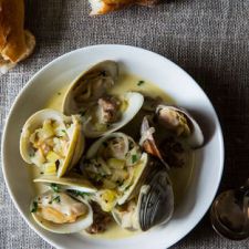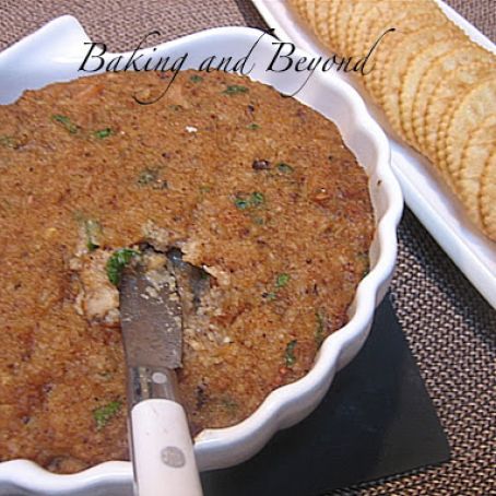 Simmer clams in juice and lemon juice for 15 minutes. In separate pan melt butter and simmer onion and all spices for 20 minutes. Then combine with clams and add bread crumbs. It will have the consistency of oatmeal. Put in dish and sprinkle with parmesan and paprika. Bake at 375 for 20 minutes. Serve with lemon slices, Tabasco and crackers