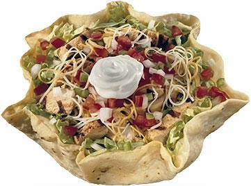 Sprinkle taco seasoning on chicken and toss. Layer all ingredients except dressings in bowl. Toss in dressings and serve in tortilla bowl with crunched nacho chips on top.