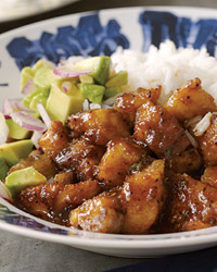 Scoop the rice into bowls. Spoon the fish on top and serve with the avocado salad.