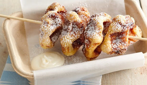 Thread 4 waffle pieces on each wooden skewer, and serve with icing. Sprinkle waffles with powdered sugar.