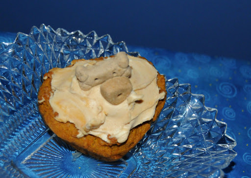 Optional frosting: 1/2 cup cream cheese and 1/2 cup peanut butter. Whipped. Decorate with Dog bone treat if desired.