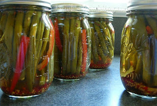 Have beans rinsed and pre-cut into 4-inch lengths (for regular wide mouth jars) or cut to fit into your jars leaving 1/2-inch to the top of the jar. Pack jars with the green beans leaving room for the garlic. Add the bay leaf and bell pepper to the side of the jar and pack tightly with more beans.