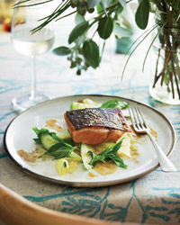 Chef Pete Evans uses green mango—which is firm and a little crunchy—for the fresh, bright salad that accompanies the salmon fillets here