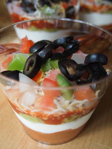 In each plastic glass, layer about 2 Tablespoons of the beans, followed by 2 Tablespoons of sour cream, 2 Tablespoons of guacamole, 2 Tablespoons of salsa or pico de gallo, and 2 Tablespoons of cheese. Make sure you drain your salsa or pico to get the excess liquid out before you pour it on. Then top with about 1-2 teaspoons of tomatoes, olives, and green onion (If making ahead of time, wait to add these toppings until shortly before serving).