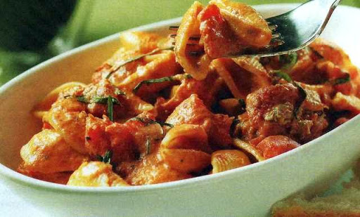 Add cream, simmer for 1 minute, then stir in cheese, basil, cooked shells, and salt. Serve immediately.