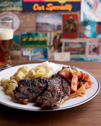 Preheat the oven to 200. Light a grill or preheat a grill pan and brush with vegetable oil. Working in batches, grill the short ribs over high heat, turning once, until nicely browned and charred in spots, about 2 minutes per side. Transfer the ribs to a rimmed baking sheet and keep warm in the oven while you grill the remaining ribs. Serve the ribs with rice, macaroni salad and kimchi.