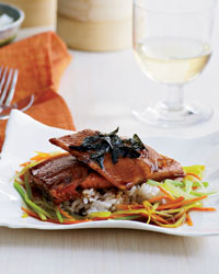 Mound rice in shallow bowls and drizzle lightly with the glaze. Using a slotted spoon, add the carrots and leeks. Top with the fish and nori and spoon the dashi into the bowls. Serve with the remaining glaze on the side.