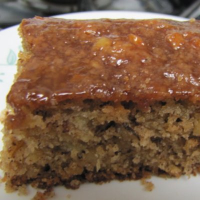 Pour and spread glaze over hot cake as soon as the cake is removed from the oven.
