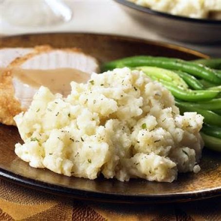 Boil potatoes until tender in salted water, drain and put back in pot to dry off any excess water. Cut butter and cream cheese in small pieces and add to potatoes along with milk. Beat until light and fluffy adding sour cream and seasonings. Place in buttered casserole dish.