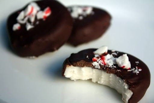 Cover another baking sheet with parchment paper. Remove patties from freezer one at a time and submerge into melted chocolate (we just used our hands). Coat quickly and allow excess chocolate to drip off. Place on parchment paper lined pan and sprinkle with crushed candies. Repeat, covering all patties with chocolate and candy.