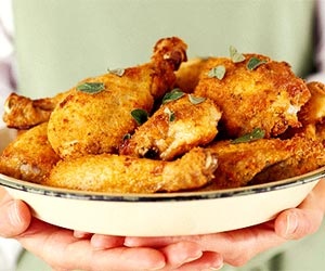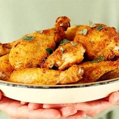 Grease roasting pan with 1 T. olive oil. Combine bread crumbs, garlic and spices. Dip chicken in buttermilk and roll in crumbs. Drizzle oil over chicken. Bake at 400 for 45-50 minutes.