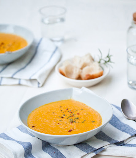 When carrots are soft, carefully blend the soup in batches in a blender (use a towel to hold the lid down firmly) or use an immersion hand blender and puree until smooth. Season with salt and pepper and garnish with fresh herbs, and more chili flakes, if desired.